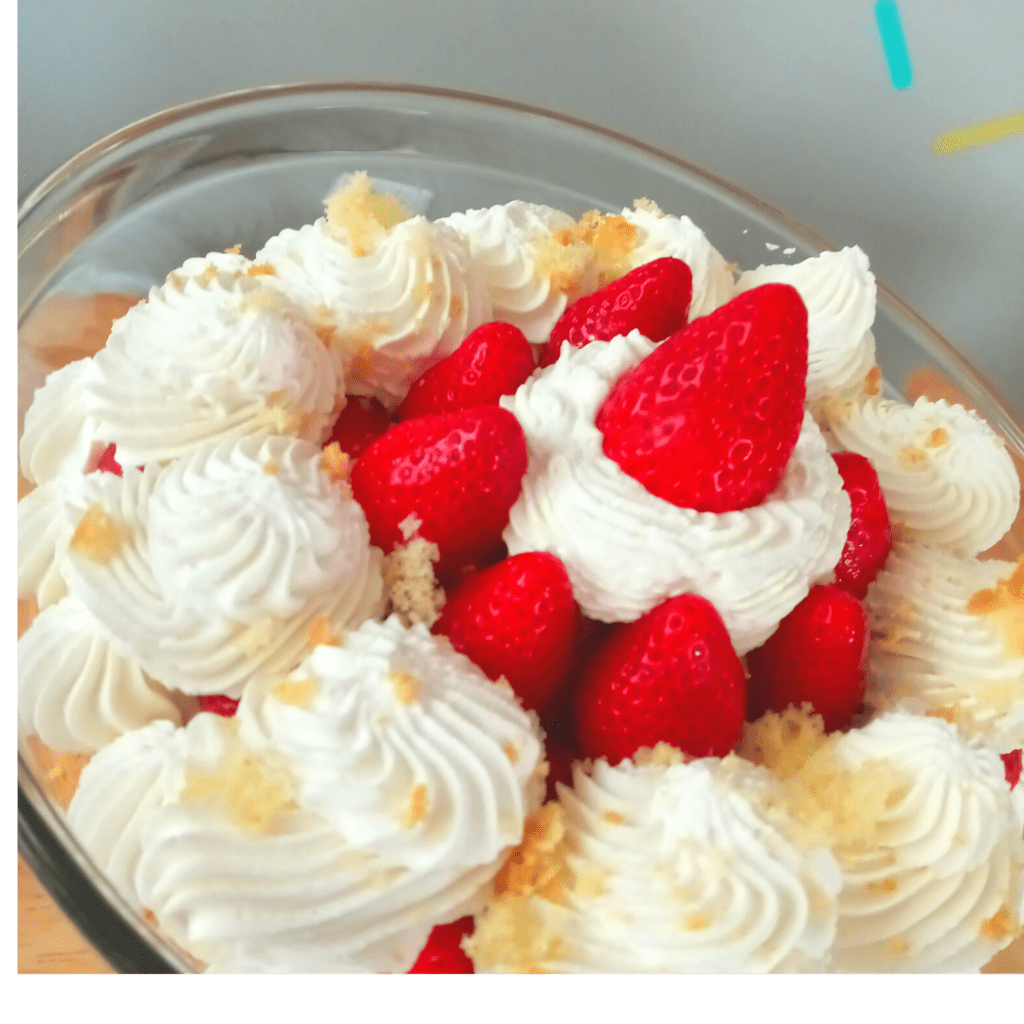 • Luego colocamos una capa de crema haciendo copetes, agregamos frutillas, la cantidad que querramos